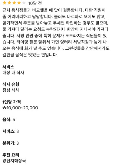 - 서비스: 사장님의 친절함과 일부 직원의 서빙 실수가 상반된 평가를 낳았습니다. 응대 지연, 주문 실수 등으로 불편을 겪은 경우가 있었으나, 맛있는 음식이 이를 상쇄한다는 의견이 보이네요.